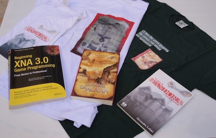 - Dentre os que assistirem ao trailer de 60 segundos do livro "O Nome da Águia" em http://www.onomedaaguia.com/, e comentarem este post com a resposta à pergunta; "Como são chamados os inimigos dos Khedoshim?", será sorteado um de meus livros e uma camiseta, à escolha do vencedor. Livros: "XNA 3.0 game programming", "O Nome da Águia" ou "A Caixa de Pandora"; Camisetas: branca, com capa alternativa de "O Nome da Águia", branca com capa de "A Caixa de Pandora" ou verde com a capa de "O Nome da Águia". Obviamente, não aprovarei os comentários com as respostas para não "entregar o jogo"!